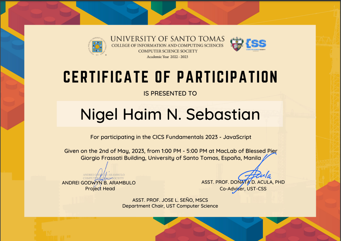 I am a currently studying at the University of Santo Tomas for my Bachelor's degree in Computer Science major in Data Science. I always look forward to expand my knowledge in programming. Challenging myself to push the boundaries of my skills to contribute more in every situation. Applying the full potential of my abilities to help build a better system for the future.